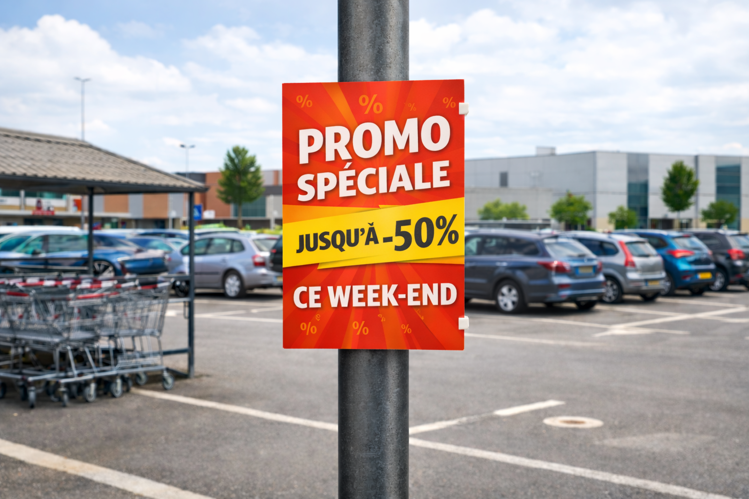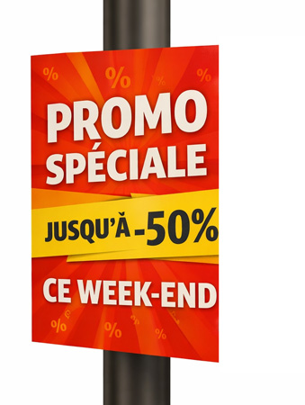 Léger, résistant et facile à installer, ce support de communication s’adapte parfaitement aux poteaux existants pour diffuser promotions, soldes, ouvertures exceptionnelles ou messages événementiels avec une visibilité maximale.